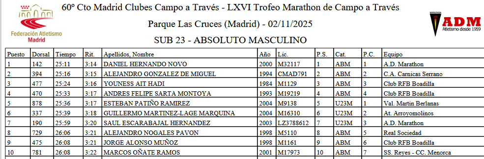 Hernando, ganador de la prueba en 2024 y que venía de marcar un formidable top diez en Amorebieta unas semanas atrás, se impuso en su prueba, disputada sobre unos 8 kilómetros, por delante de Alejandro González (Cárnicas Serrano) y Youness Ait Hadi (Club RFB Boadilla).
