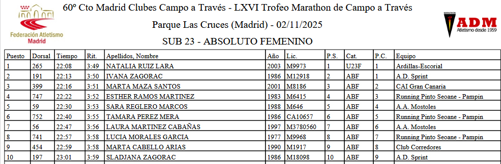 Previamente Zagorac, había sido la segunda atleta clasificada en su carrera, una competición sobre 5,8 kilómetros que estuvo dominada por la sub-23 Natalia Ruiz, consecuentemente campeona en esa categoría ante Paula Urban (Getafe) y Carolina Morales (Móstoles). Zagorac batió a Marta Maza (CAI-Gran Canaria) y a Esther Ramos (Running Pinto Seoane Pampín).