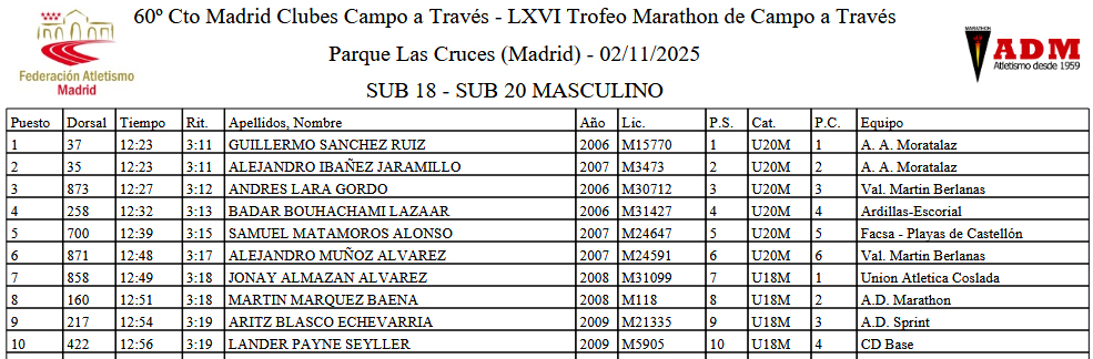 En la prueba sub-18 y sub-20 masculina, gran dominio de la Asociación Atlética Moratalaz. Guillermo Sánchez y Alejandro Sánchez encabezarán la carrera, con el título sub-20 para el primero por delante de su compañero y con Andrés Lara (Martín Berlanas) completando el podio. Por clubes, en sub-20, Moratalaz se lleva el triunfo por delante de Martín Berlanas y de la AD Marathon. En la categoría sub-18 Jonay Almazán, de la Unión Atlética Coslada, sube a lo más alto del cajón por delante de Martín Márquez (AD Marathon) y Aritz Blasco (AD Sprint). Por clubes el título será para la AD Marathon por delante de la AD Sprint y Atletismo Fuenlabrada.