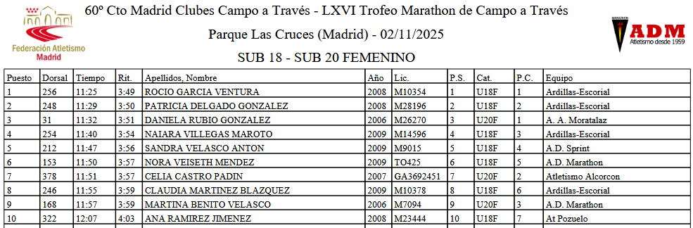 En la categoría sub-18 femenina Patricia Delgado (Ardillas-Escorial) logrará el triunfo por delante de Sandra Velasco (AD Sprint) con una tercera plaza para la ‘marathoniana’ Nora Veiseth. Por equipos, Ardillas-Escorial se impondrá al AD Marathon, segundo, y al AD Sprint. En la categoría sub-20 femenina Rocío García, de Ardillas-Escorial, se hace con el título frente a Daniela Rubio (AA Moratalaz) y Naiara Villegas (Ardillas-Escorial). La entidad escurialense repetirá título, por delante de la AD Marathon y del Atletismo Alcorcón.