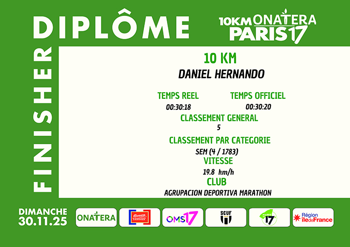 Hernando finalizó en una destacadísima quinta posición en esta rompepiernas edición 39 de la carrera, con un tiempo de 30:18. El distrito 17 es una zona de París con mucha concentración de embajadas, diversas plazas y parques, con un museo de arte urbano al aire libre y una variada y animada oferta de restauración.