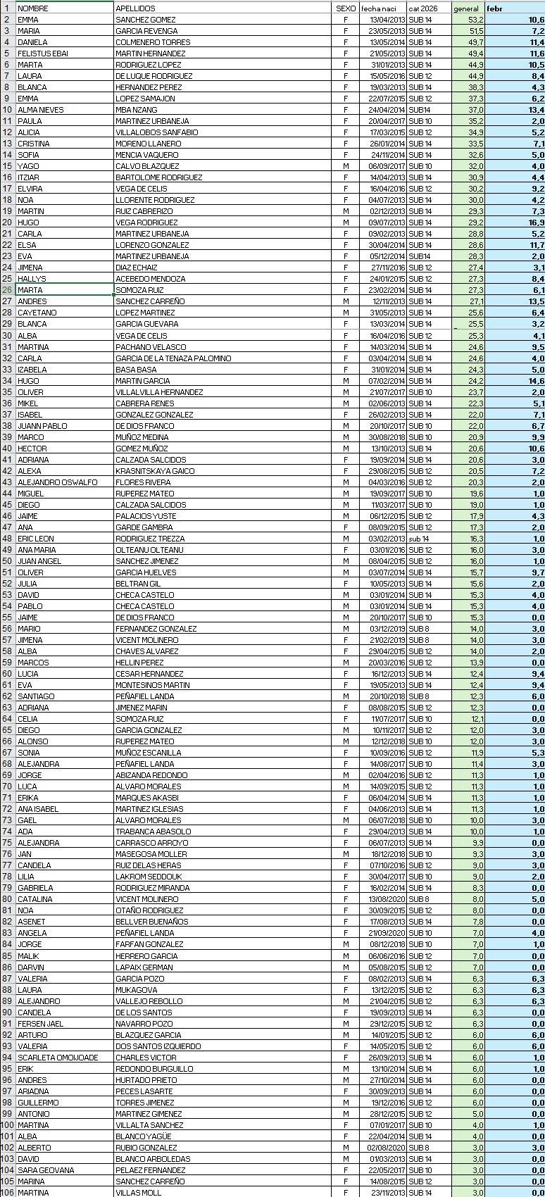 Por categorías, Catalina Vincent y Santiago Peñafiel volvieron a encabezar la clasificación dentro de la sub-8 y la sub-10 echó el cierre al mes con Ángela Peñafiel y Marco Muñoz al frente. Elvira Vega y Alejandro Vallejo lideraron febrero dentro de la categoría sub-12 y los citados Mba y Vega, la sub-14. Ésta categoría se hizo fuerte durante el mes más corto del año, con hasta quince atletas de esta categoría dentro del top-20 y un pleno en el top diez.